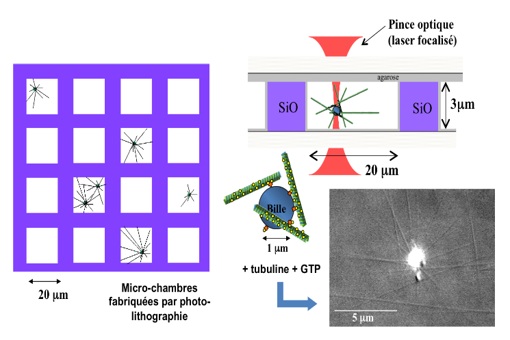 On complexifie maintenant le système en reconstruisant un aster de MTs à partir d'une bille de 1 μm qui mime le centre d'organisation des MTs (le centrosome dans la cellule) et on enferme cet aster artificiel dans une micro-chambre de 20 μm de côté qui « mime » le confinement induit par le contour d'une cellule et on observe le positionnement d'un aster au centre de la cellule uniquement induit par la force de polymérisation des MTs. On peut ensuite s'intéresser au cas plus complexe de deux asters confinés, ou encore utiliser une pince optique pour déplacer l'aster et étudier son repositionnement ou encore mesurer l'amplitude des forces générées par le positionnement. - @ C. Moskalenko