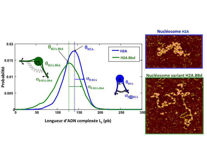 La distribution d'ADN complexée est tracée pour plusieurs centaines de nucléosomes conventionnels H2A (en bleu) et H2A.Bbd (légèrement différent dans sa composition en protéines, en vert) et montre que le mono-nucléosome H2A est en moyenne plus complexé en ADN que le variant H2A.Bbd (valeur de θ) mais moins dynamique, l'amplitude des fluctuations σ étant réduite. Cette différence à l'échelle du mono-nucléosome a des conséquences importantes à l'échelle de la fibre de chromatine comme illustré sur les images AFM de la figure 4 : les fluctuations de longueur complexée limitent la capacité de la fibre de chromatine à se compacter, ce qui est nécessaire pour faire entrer les 2 m d'ADN contenus dans le noyau de nos cellules (environ 5 μm) ! - @ C. Moskalenko