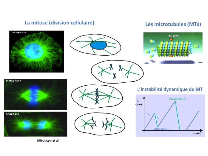 Le microtubule est un polymère de protéines qui forme un tube creux et fait partie du cytosquelette. Dans nos cellules ce polymère est organisé sous la forme d’une étoile que l’on appelle un aster, et ce sont eux qui donnent sa rigidité à la cellule. Cet aster a un rôle important dans plusieurs phénomènes cellulaires, en particulier au moment où la cellule se divise. L'aster de microtubules est dupliqué en deux asters. Chacun migre de part et d’autres des chromosomes pour les accrocher au centre de la cellule dans le plan médian, puis vient tirer sur les chromosomes pour séparer les 2 chromatides (ou copies du génome) et former 2 cellules identiques. Le microtubule est donc un acteur à la fois de la mécanique mais aussi de la dynamique intra-cellulaire capable de générer des forces lui permettant de pousser (en polymérisant) puis tirer (en dépolymérisant) sur les chromosomes. Il est remarquable pour 2 propriétés particulières :