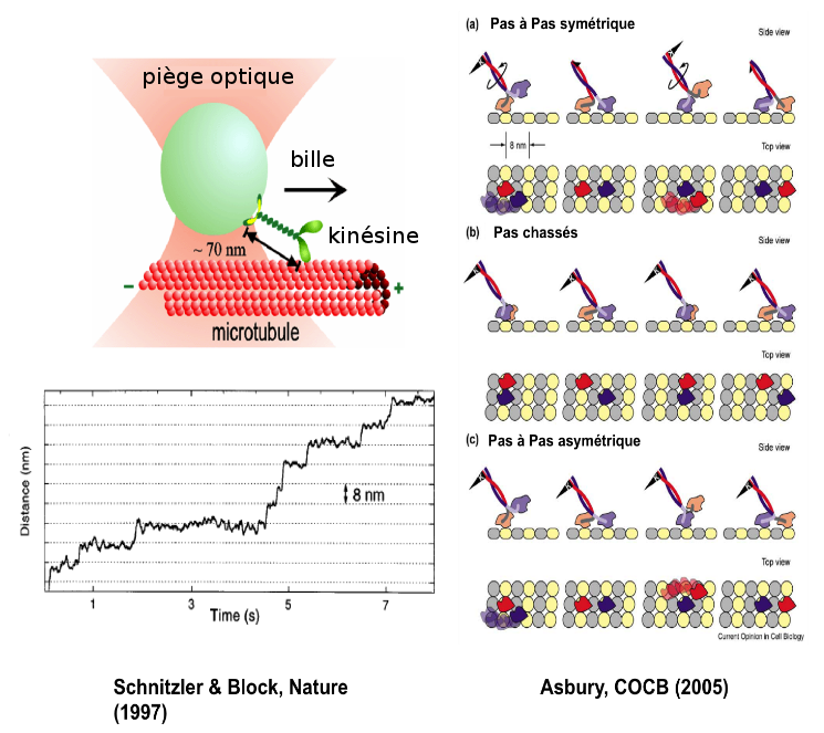 Dans cette expérience (Schnitzer and Block, Nature - 1997), les auteurs visualisent le déplacement de la bille micrométrique par rapport au centre du piège optique en réponse à la traction exercée par la kinésine qui avance sur son rail : le MT. En observant ce déplacement en fonction du temps, on observe des marches successives de hauteur 8 nm : c'est le pas de la kinésine qui correspond exactement à la taille du maillon élémentaire du microtubule (un diamètre de tubuline). Le bruit sur la trace correspond aux fluctuations thermiques qui sont toujours présentes à cette échelle. À droite : les différents modèles de marche : pas à pas (symétrique ou asymétrique) ou pas chassé. - @ Asbury, Current Opinion in Cell Biology, 2005