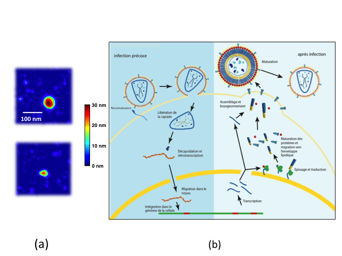Pour revenir à une échelle plus moléculaire, on a aussi complexifié toutes les interactions entre les différents éléments que les chercheurs ont bien compris à l’échelle moléculaire, et on étudie maintenant des interactions avec des complexes multiples ADN-protéines (chromatine), l'interaction de l'ADN avec plusieurs protéines régulatrices. Et puis, comme je le fais depuis 2009, il y a aussi pas mal de choses qui se développent autour des virus, ce que l’on appelle la virologie physique, pour essayer de comprendre les étapes du cycle d’infection des virus (figure 3).