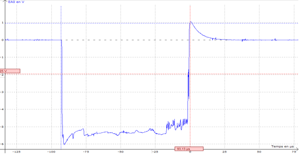 Nous avons alors réalisé la mesure de la durée du contact sans papier d'aluminium entre les boules, et avec papier d'aluminium entre les boules. Un exemple de mesure de la durée du choc avec papier d'aluminium entre les 2 boules est donné figure 11, ici on a trouvé environ 93 \(\mu\)s.