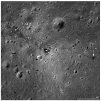 Figure 8. Traces de rover lunaire photographiée par LRO (lunar Observer NASA) le 3 mai 2012 à 25 km d'altitude Les flèches blanches repèrent l'étage de descente du LEM et la station scientifique ALSEP. Source : NASA / Arizona State University |