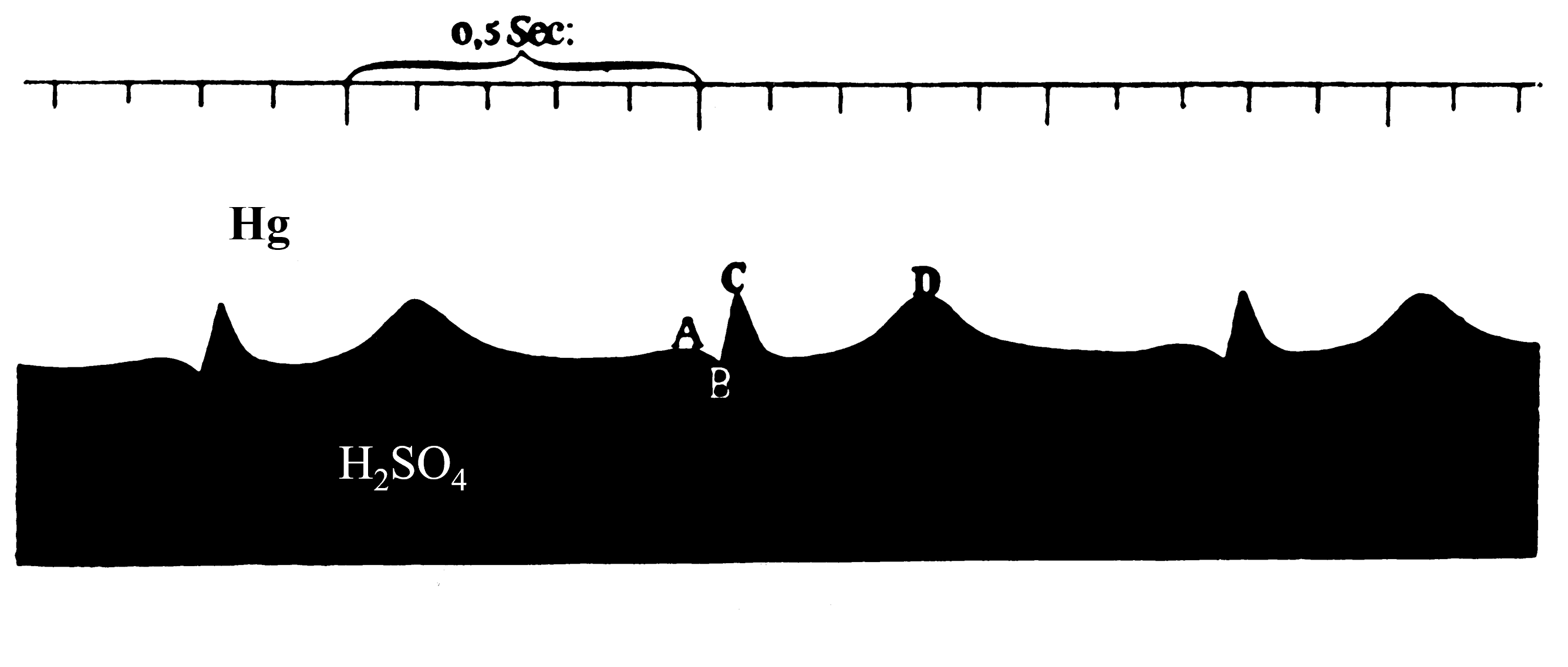 Figure 8. Electrocardiogrammes réalisés avec un électromètre capillaire À partir de 1895, Einthoven réalise des mesures très nettes avec l'électromètre capillaire, qui lui serviront ensuite à déterminer la forme réelle de l'électrocardiogramme en prenant en compte la distorsion due aux limitations de l'appareil. Source : Image d'après Ueber die Form des menschlichen Electrocardiogramms, 1895. |