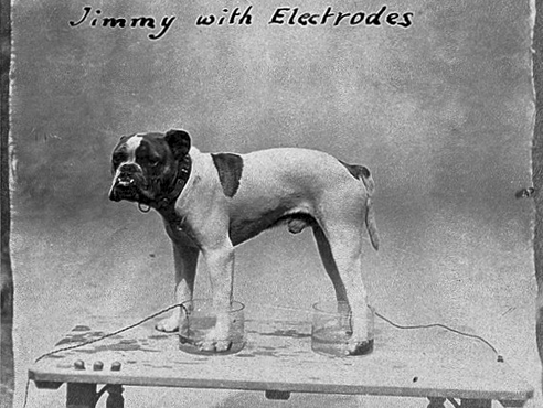 Figure 7. Jimmy, le chien d'Augustus Waller À partir de 1887, Waller utilise l'électromètre capillaire pour mesurer des électrocardiogrammes, notamment lors de réunions publiques sur son chien, que l'on voit ici les pattes trempées dans une solution saline permettant de réaliser un contact électrique. Source : Image d'après Wellcome Collection, CC BY-SA 4.0. |