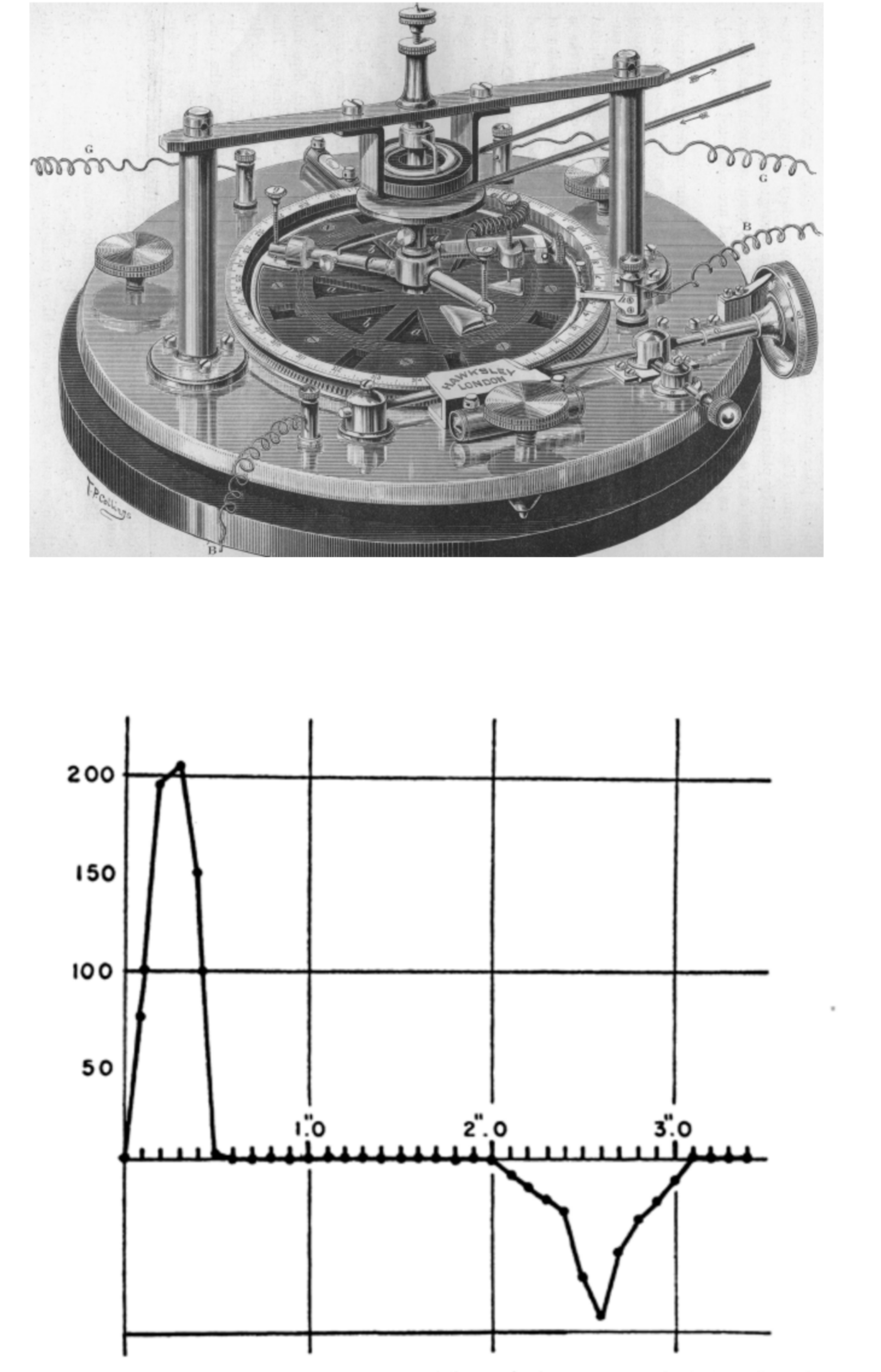 Figure 5. Rhéotome de Burdon-Sanderson & Page et mesure du signal cardiaque d'une tortue Avec leur rhéotome, Burdon-Sanderson & Page réalisent cette mesure du signal cardiaque d'une tortue, qui indique l'intensité mesurée en fonction du temps (en secondes). On y voit pour la première fois la compression des ventricules (pic de gauche) suivi d'une période réfractaire (sans signal) et enfin la relaxation des ventricules (pic négatif de droite). Source : Image d'après On the Time-Relations of the Excitatory Process in the Ventricle of the Heart of the Frog, The Journal of physiology, 1880. |