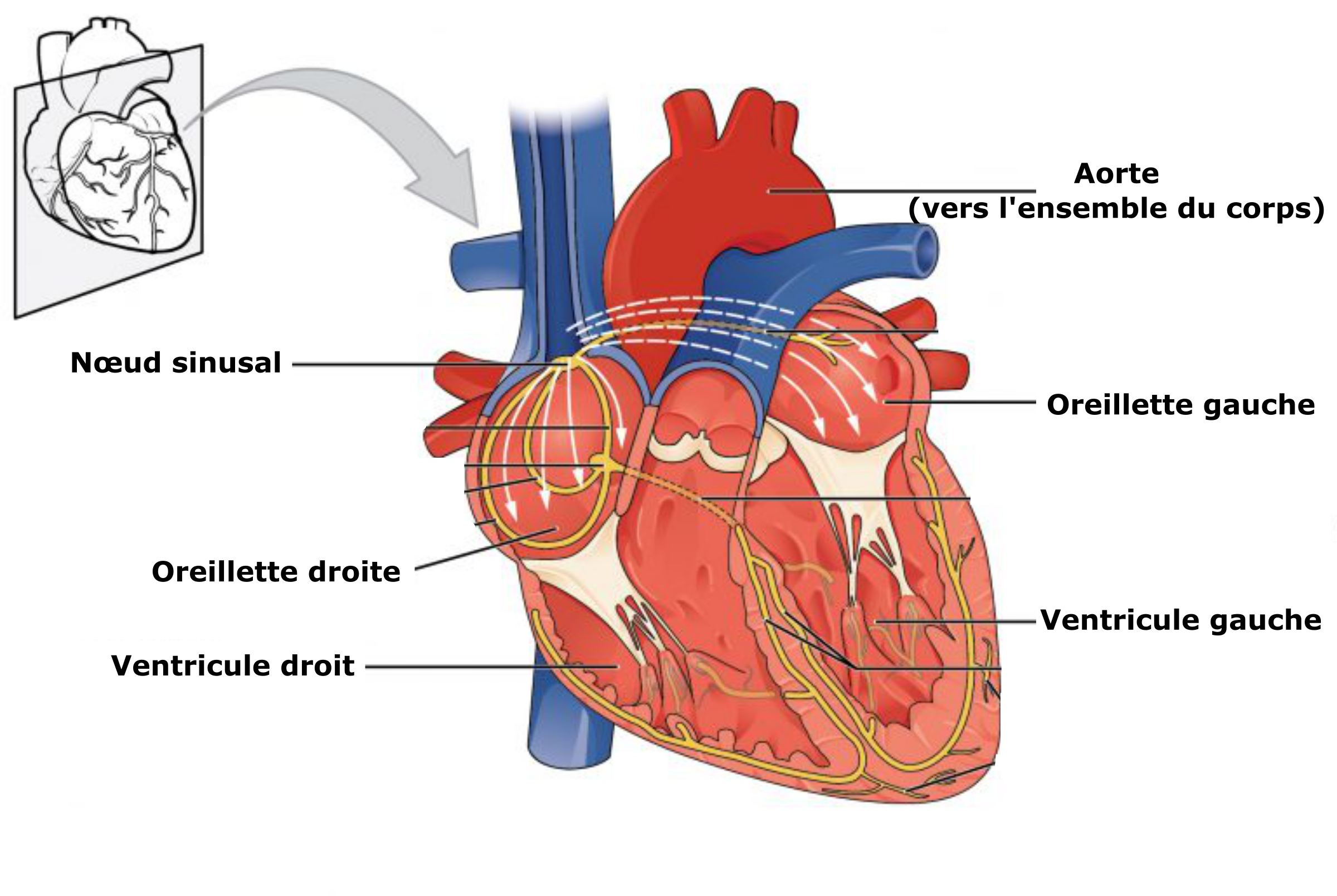 Le cœur humain est un organe musculaire fonctionnant comme une pompe qui assure la circulation du sang dans le corps. Il est constitué de deux parties, gauche et droite, séparées par une épaisse paroi. La partie droite pompe le sang désoxygéné (en bleu) vers les poumons alors que la partie gauche envoie le sang oxygéné (en rouge) dans l'organisme via l'aorte. Toutes les secondes environ, le nœud sinusal sur le cœur, ici en jaune, émet une petite impulsion électrique, qui contracte d'abord les oreillettes sur lesquelles sont branchées l'aorte et les artères – c'est ce qui provoque ce qu'on appelle l'onde P sur l'électrocardiogramme – puis ce signal vient stimuler la compression des ventricules droits et gauches qui vont pomper le sang – c'est le complexe QRS sur l'électrocardiogramme – et enfin tout vient se repolariser et se relâcher, c'est l'onde T. C'est cette séquence qui donne cette forme caractéristique de l'ECG. En cas de soucis de rythme cardiaque, la forme de l'ECG permet bien souvent de l'identifier et de sélectionner le bon traitement, évitant les interventions chirurgicales.