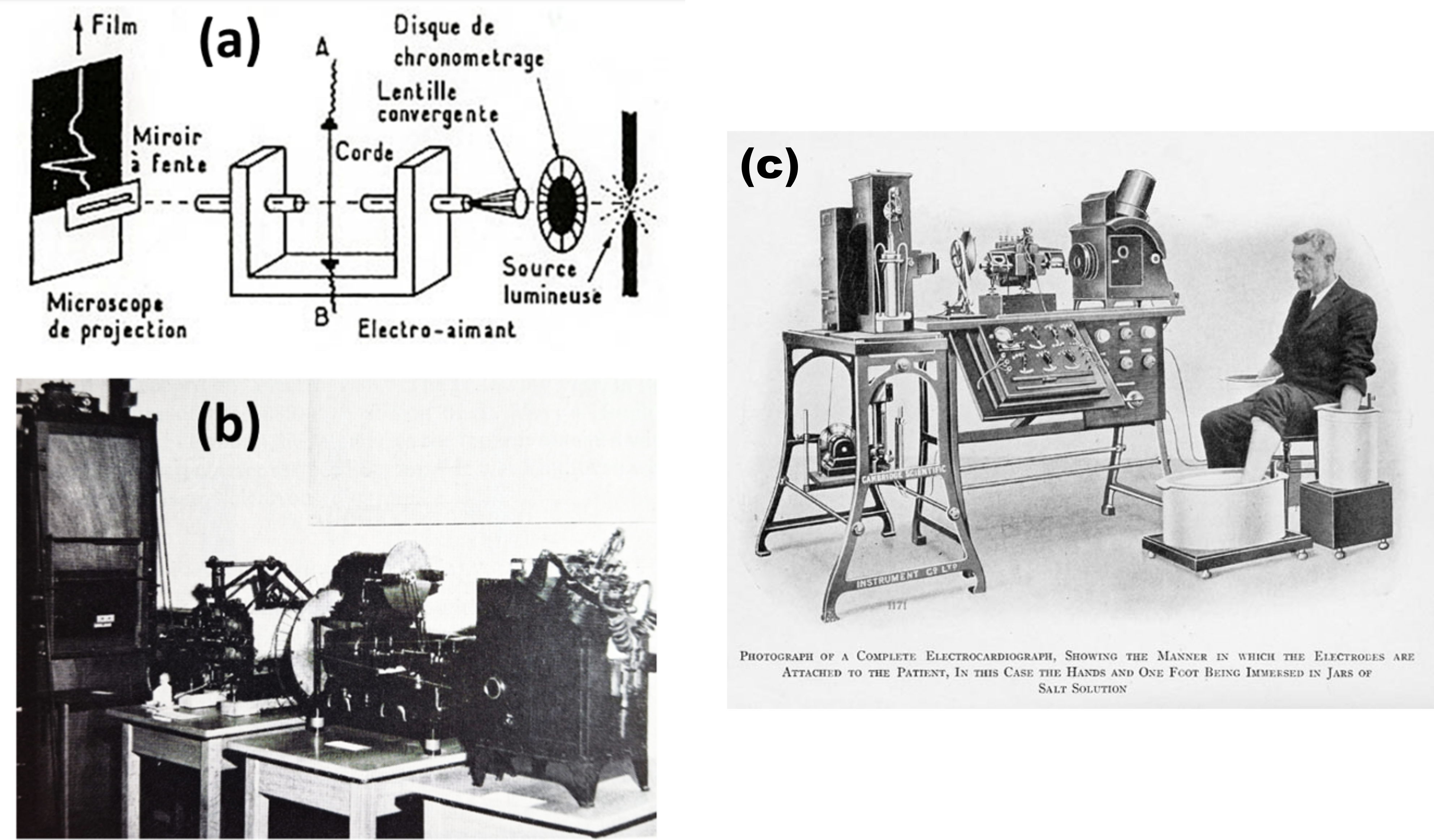 Au XIXe siècle, une série de collaborations entre médecins et physiciens a conduit à la mise au point à Leyde du premier appareil mesurant un électrocardiogramme par Einthoven, qui reçut le Prix Nobel de Médecine en 1924. Les premières détections de signaux électriques cardiaques, réalisées en 1856 avec des cuisses de grenouilles comme outils de mesure, furent progressivement améliorées. D'abord par Burdon-Sanderson grâce à un galvanomètre à induction, puis par Waller en 1887 à Londres grâce à l'électromètre capillaire au mercure mis au point par Lippmann à Paris en 1875. Enfin, Einthoven met au point le galvanomètre à corde, un grand succès d'intégration technologique, qui deviendra l'instrument clinique de référence pour l'électrocardiogramme à partir de 1908.