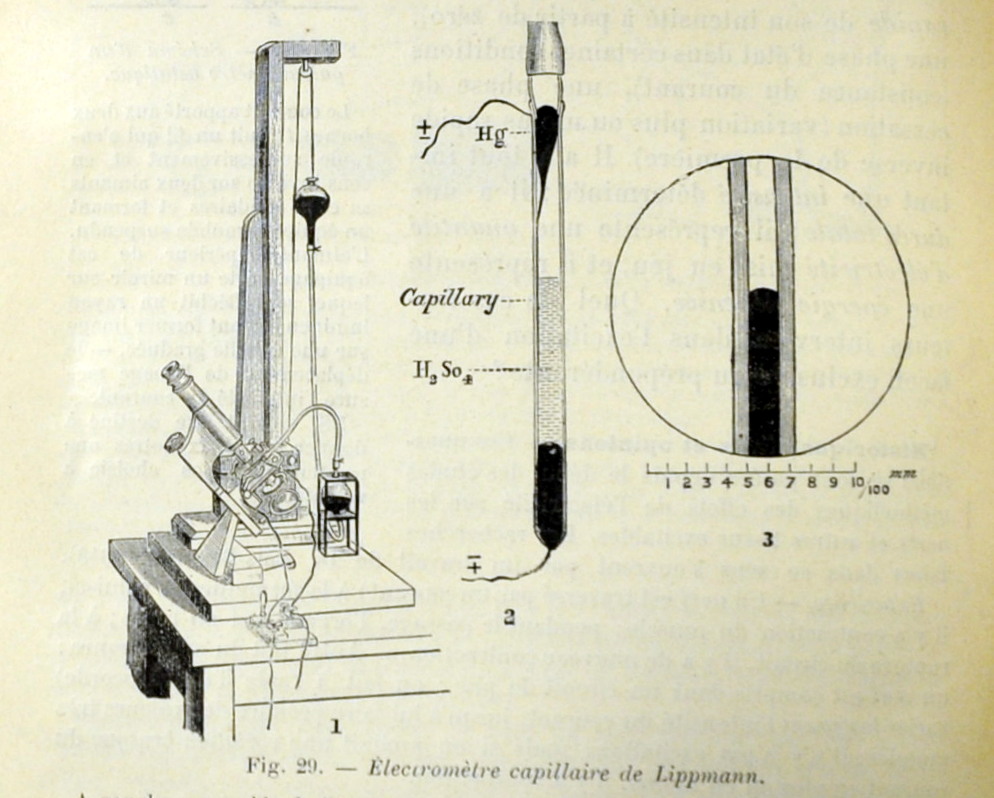 Figure 6. Électromètre capillaire de Lippmann En 1875, Lippmann met au point l'électromètre capillaire, dans lequel un ménisque entre du mercure (Hg) et de l'acide sulfurique (H2SO4) est observé dans un capillaire d'une dizaine de micromètres de diamètre sous microscope. En polarisant les fluides de part et d'autre du ménisque, ce dernier se déplace dans le capillaire proportionnellement à la différence de potentiel entre les fluides. Source : Image issue de la bibliothèque universitaire de Santé de Lyon, référencée comme Electromètre capillaire de Lippmann, Morat, Jean-Pierre ; Doyon, Maurice. Traité de physiologie, T.2. Paris : Masson et Cie, 1902. |