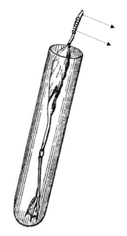 Figure 2. Galvanoscope à cuisse de grenouille Source : Image d'après Wikimedia. Le galvanoscope à cuisse de grenouille, développé par Galvani puis considérablement stabilisé par Matteucci, consiste à enfermer une cuisse dont le nerf est mis à nu dans un tube à essai. En plaçant le nerf sur la zone émettrice de signaux électriques, la cuisse se contracte. C'est avec ce galvanoscope que Kölliker et Müller en 1856 identifièrent que le cœur émet des signaux électriques lors de ses battements réguliers. |