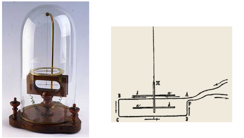 Figure 3. Galvanomètre de Nobili Vers 1825, Leopoldo Nobili met au point ce galvanomètre, dans lequel la rotation horizontale d'une aiguille aimantée attachée à l'axe vertical dépend directement de l'intensité du courant qui circule dans une bobine qui entoure l'aiguille. Il s'agit d'un des premiers galvanomètres quantitatifs. Les deux aiguilles, l'une intérieure au cadre, l'autre extérieure, sont fixées à une tige verticale, de façon à rester rigoureusement parallèles entre elles. Les deux aiguilles permettent de rendre le galvanomètre astatique, c'est-à-dire indépendant du champ magnétique terrestre. L'ensemble est suspendu à un fil sans torsion. Les pôles des deux aiguilles étant opposés, l'action du circuit sur l'aiguille supérieure, due principalement au côté AB, est de même sens que sur l'aiguille inférieure. Si les aiguilles avaient exactement la même aimantation, l'équipage serait complètement soustrait à l'action terrestre et se placerait perpendiculairement au courant. En pratique l'aimantation des aiguilles diffère toujours très légèrement. L'action directrice de la terre n'est donc pas supprimée mais notablement diminuée [5]. Source : Francis Gires ASEISTE (Musée Bernard d'Agesci, Niort) - D'après Ampère a-t-il inventé le galvanomètre, le télégraphe, l'électroaimant, le moteur électrique... ? , par Christine Blondel et Bretrand Wolff [5]. |