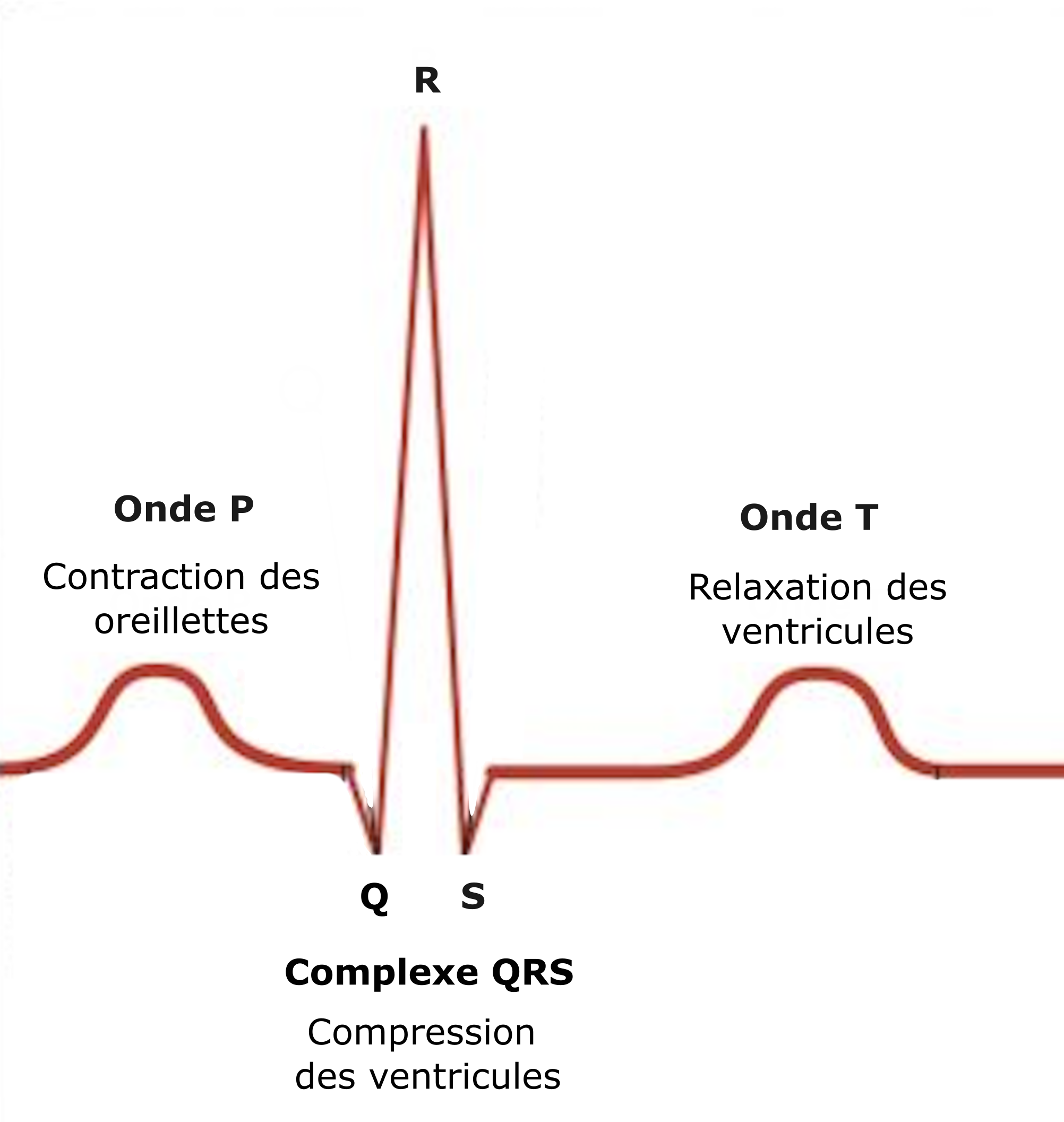 Forme caractéristique d'un électrocardiogramme sur une personne sans problème cardiaque (voir texte) Source : Image adaptée de Assessment of Cardiovascular Function,CC BY 4.0. |