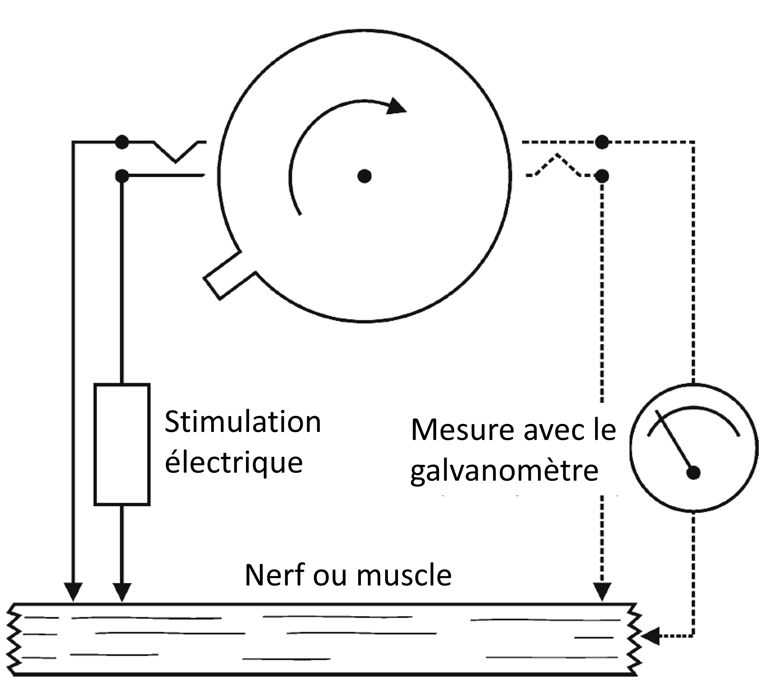 Là encore, les progrès techniques des physiciens ont été indispensables aux physiologistes, ils sont issus cette fois de Heidelberg au sein du laboratoire de du Bois-Reymond et de Helmholtz (qui était professeur de physiologie avant d'être le célèbre professeur de physique à Berlin). Helmholtz et du Bois-Reymond mettent au point le rhéotome, un appareil permettant d'améliorer considérablement la résolution temporelle, que Bernstein en 1868 va améliorer sous sa forme différentielle (voir Figure 4) : un mécanisme de commutation sur une roue tournante à vitesse fixe va d'abord connecter le muscle étudié à une excitation électrique, puis après un demi-tour de la roue, va connecter le muscle au galvanomètre afin de mesurer le courant. Après stabilisation sur plusieurs tours, le système indique le signal électrique après un temps fixe connu juste après l'excitation, correspondant à un demi-tour de roue. En variant la vitesse de rotation, on peut successivement analyser tout le profil du signal après l'excitation en le découpant en petits morceaux de temps, d'où le nom de rhéotome qui signifie « couper le courant ». Avec cet appareil, Engelmann en 1873 va confirmer avec précision les premières mesures de Kölliker et Müller en 1856 qui avaient démontré, avec un galvanoscope à cuisse de grenouille, que le cœur de tortue émet une impulsion électrique lors de ses battements (les tortues étant choisies pour la lenteur de leurs battements cardiaques) [4].