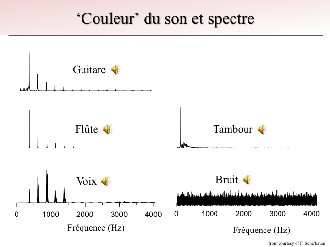 Sur la figure 3 sont représentés les spectres de plusieurs instruments de musique. Les spectres de gauche correspondent tous à la même note « do » interprétée par une guitare, une flûte et la voix. Cliquez sur le lecteur ci-dessous pour entendre ces 3 extraits.