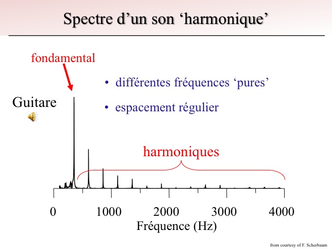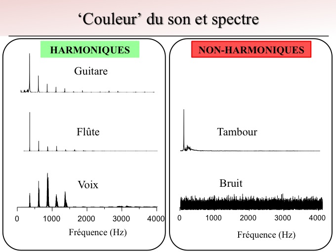 Ainsi le timbre du son correspond à la relative amplitude des harmoniques présentes dans le spectre.