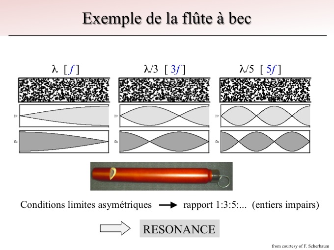 La flûte à bec peut se modéliser au premier ordre comme un résonateur avec des conditions aux limites asymétriques : un tuyau ouvert à une extrémité et fermé à l'autre. Dans ce cas, à l'extrémité fermée la vitesse s'annule (les molécules ne peuvent pas bouger) et la pression est maximale.