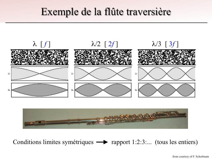 Encore une fois, tout comme la corde de guitare, les conditions aux limites fixent les modes propres du système. Les conditions aux limites symétriques donnent un rapport 1, 2, 3, ou plus généralement des entiers multiples de la fréquence fondamentale du système.