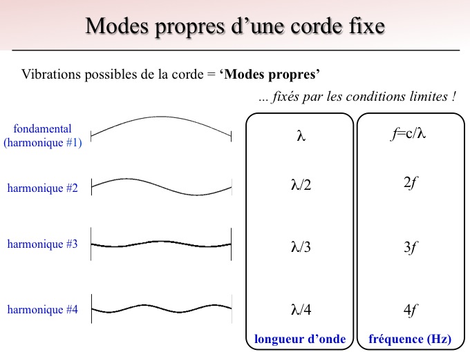 La figure 6 présente les différents modes propres de vibration d'une corde fixée à ses 2 extrémités. A chaque mode correspond une longueur d'onde, donc une fréquence : f pour le fondamental, puis 2f, 3f, etc.