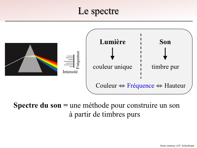 Pour le son on peut faire une analogie parfaite. Un son peut se décomposer en une somme de fréquences pures. En acoustique cela s'appelle la hauteur du son. Elle ne correspond pas à son intensité mais à sa fréquence. Un son va être plus ou moins haut, on dit plus ou moins aigü.