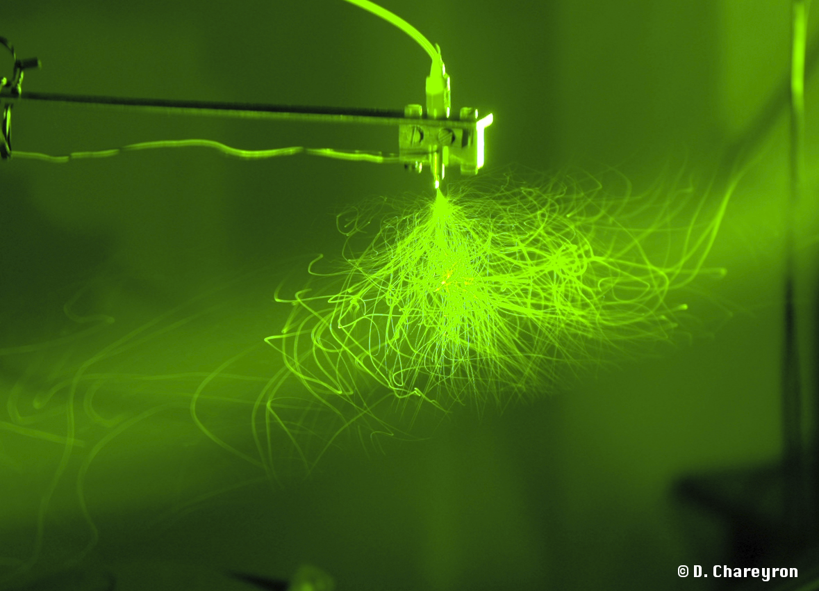 On s'intéresse ici à l'utilisation de l'holographie pour étudier le comportement de toutes petites gouttelettes d'eau (60 microns) dans un écoulement turbulent. L'illustration est donnée sur la figure 1, photo prise en pause longue qui permet de visualiser les trajectoires des gouttelettes.