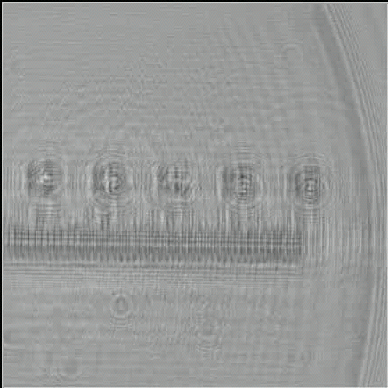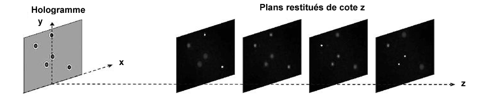 La figure 5, illustre le principe de reconstruction par mise au point numérique. Un algorithme vient analyser chaque plan selon l'axe z afin de déterminer la position des particules dans le volume. Dans l'illustration, on cherhce à retrouver la composante z d'une mire placée dans le volume éclairé.