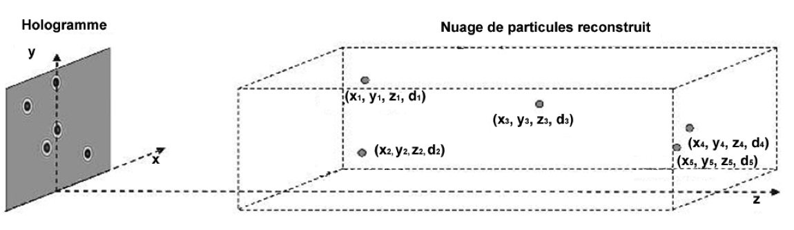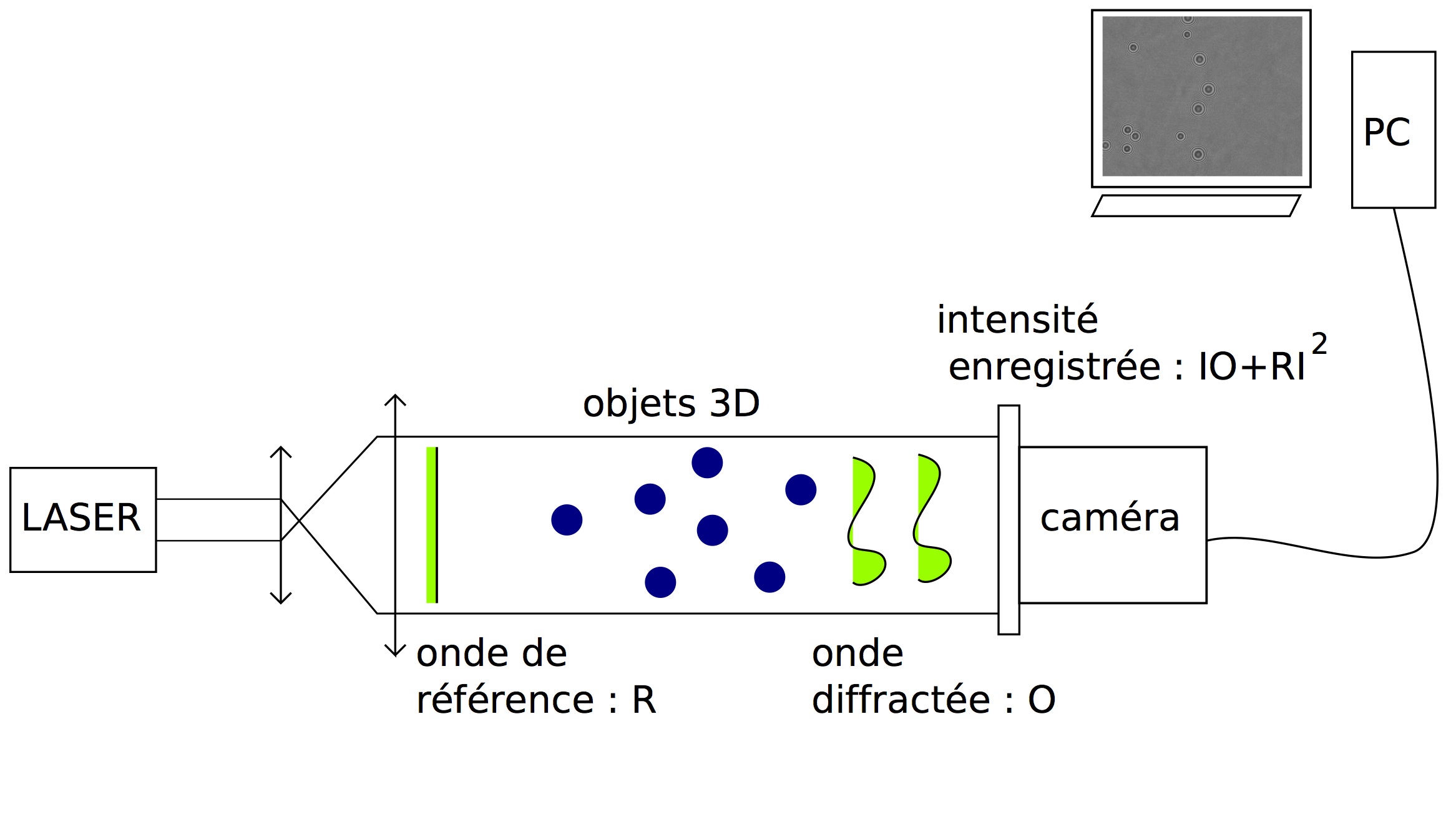 Les informations 3D des particules illuminées sont enregistrées sur un capteur 2D et sont ensuite reconstruites grâce aux propriétés de cohérence de la source de lumière utilisée. Pour une bonne cohérence spatiale, la source doit être ponctuelle. La cohérence temporelle elle, est liée au caractère monochromatique de la source.