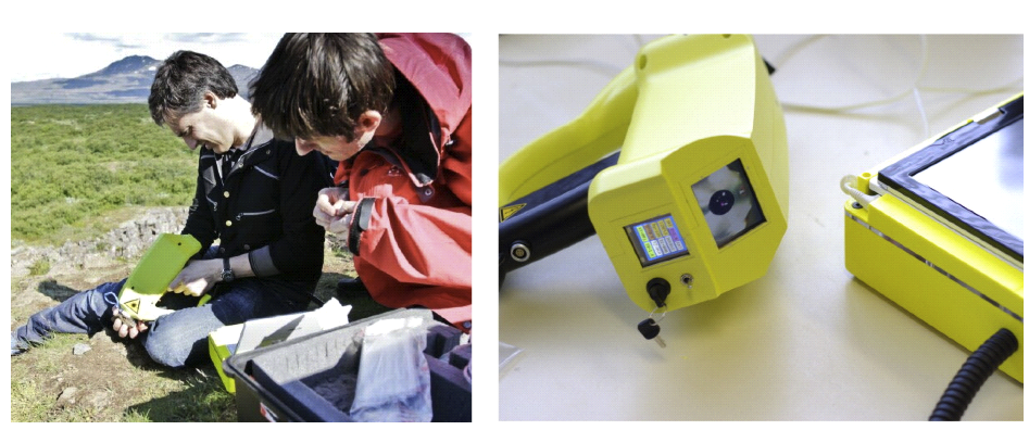 Enfin, les mesures sur site ne nécessitent pas de grands systèmes, mais peuvent être totalement portables. Aujourd'hui, des pistolets LIBS sont disponibles. Ces systèmes sont composés d'un « pistolet » de la taille d'un sèche-cheveux, contenant le laser et les systèmes optiques, relié à un sac à dos contenant l'instrumentation de détection (spectrographe et détection) ainsi que des batteries. La Figure 9 représente l'un de ces systèmes utilisés pour des mesures géologiques lors d'une campagne en Islande [7].