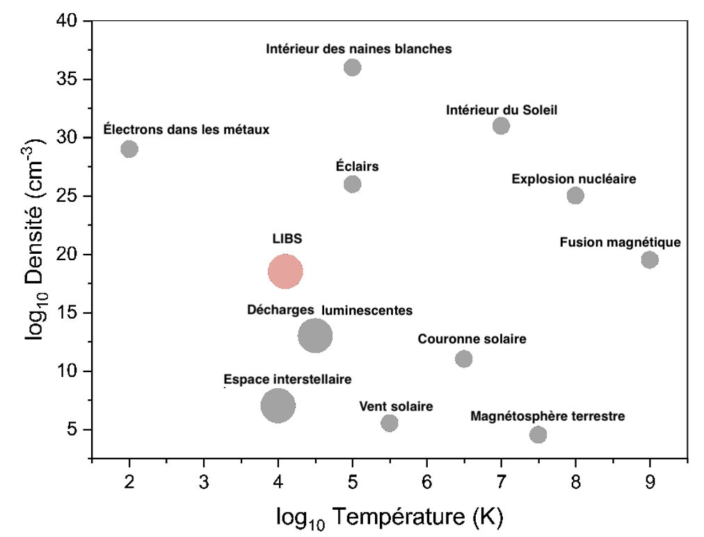 Dans les techniques spectroscopiques basées sur le plasma, deux des propriétés les plus couramment utilisées pour caractériser le plasma sont la température et la densité des électrons. La température du plasma est déterminée par l'énergie des composants du plasma ; s'agissant d'un système multi-espèces, il peut y avoir plusieurs températures, une pour chaque espèce. Une autre caractéristique des plasmas est la densité des espèces par unité de volume (densité d'électrons, d'ions ou de particules neutres). La figure 3 présente une classification des différents types de plasmas produits par différentes sources, naturelles ou générées en laboratoire, en fonction de la densité d'électrons et de la température.
