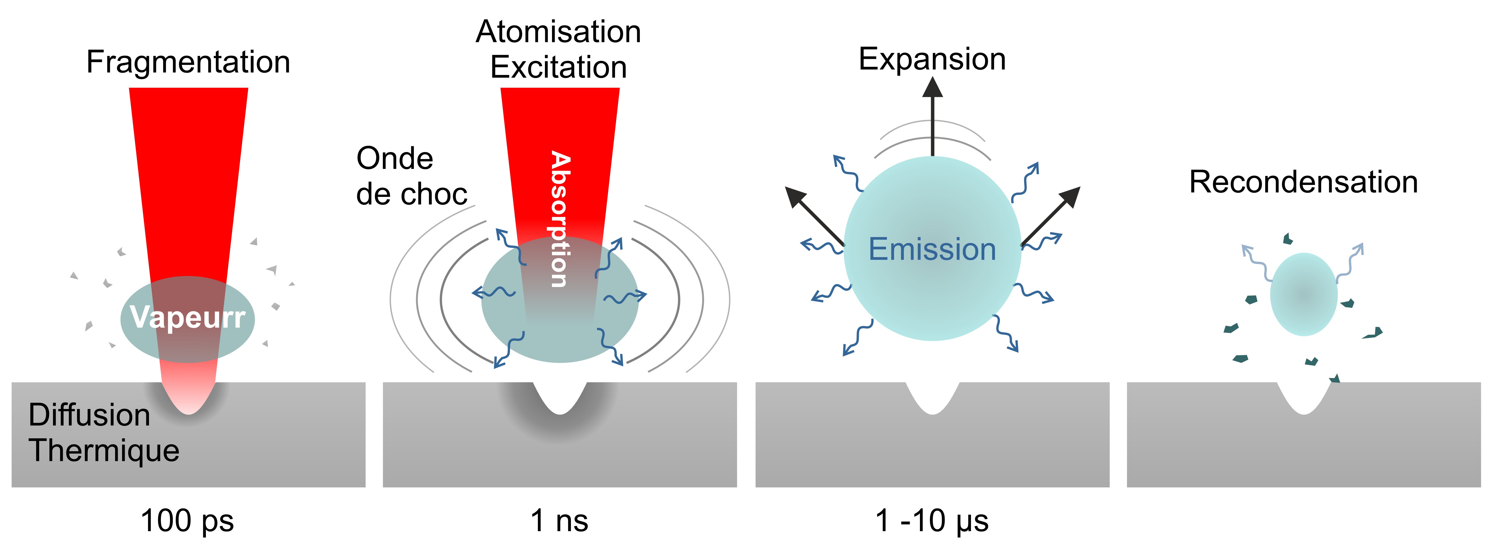 Grâce à des systèmes optiques, lentilles ou miroirs, cette puissance peut être focalisée sur une zone minuscule, de l'ordre du micromètre carré (environ 50 fois plus petit qu'un cheveu). Le résultat est une concentration de lumière telle que la matière à cet endroit explose littéralement, la matière ciblée n'a pas le temps de dissiper l'énergie et elle est instantanément vaporisée et ionisée : c'est l'ablation laser (voir Figure 1).