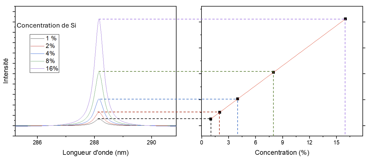 Figure 6. Représentation du processus de quantification dans la LIBS pour un échantillon de silicium L'intensité maximale d'émission de la ligne d'émission, mesurée dans plusieurs échantillons présentant différentes concentrations, est représentée dans un graphique afin d'établir une fonction reliant l'intensité et la concentration. Source : César Alvarez-Llamas et al. |