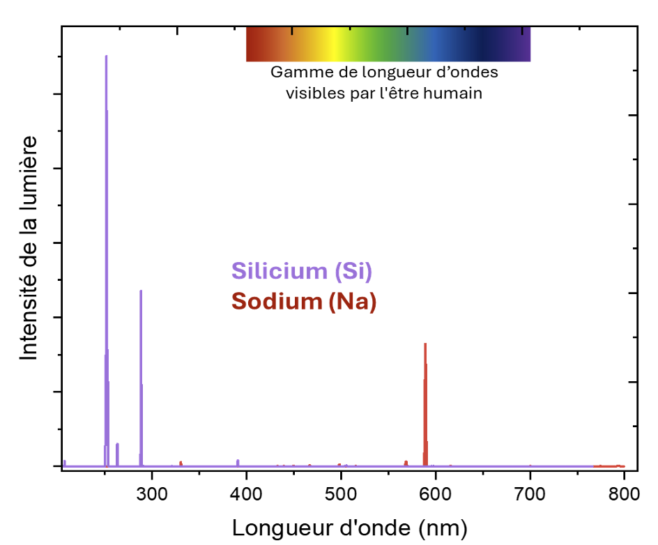 La Figure 2 représente deux spectres d'émission LIBS : du silicium et du sodium. La gamme d'émission typique détectée en LIBS va de l'ultraviolet à l'infrarouge. Pour identifier un élément, le Si par exemple, nous effectuons une recherche dans les bases de données (le NIST « National Institute of Standards and Technology » du gouvernement américain possède l'une des bases de données les plus utilisées) qui nous indique la position exacte des raies d'émission de chaque élément. Dans ce cas, elle nous indique que l'on doit observer une série de lignes d'émission au-dessus de 250 nm (sur la figure, il n'y en a qu'une seule, mais si l'on zoome, on pourrait voir qu'il y en a plusieurs très proches les unes des autres), et une autre ligne à 288,15 nm. Pour le sodium, il doit y avoir deux lignes très proches l'une de l'autre près de 590 nm (exactement à 589,592 4 nm et 588,995 0 nm). Ces deux exemples sont faciles. Mais, par exemple, pour un élément très courant comme le fer, on observera plus de 13 000 raies d'émission entre 200-800 nm, la grande majorité d'entre elles se situant entre 200 et 350 nm.