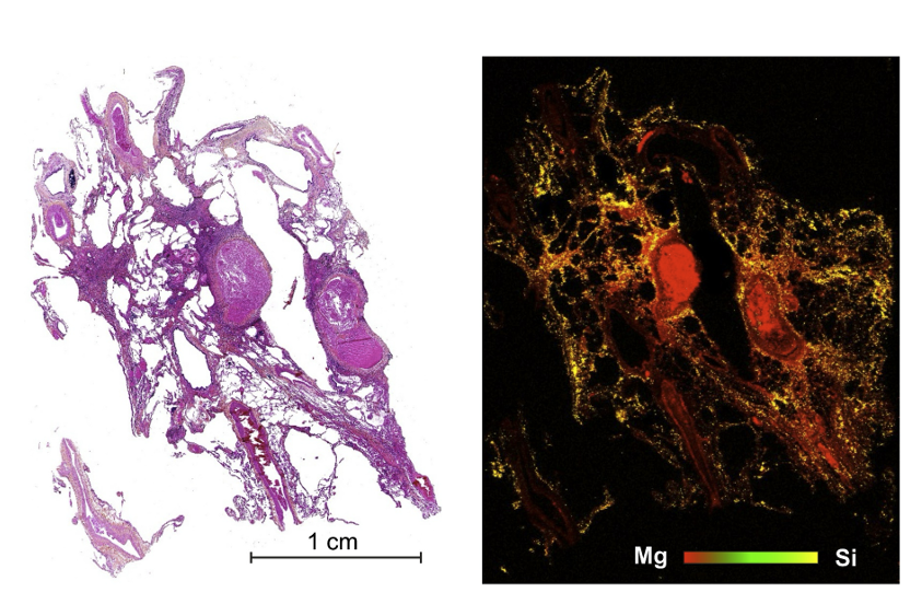 Figure 7. Imagerie d'un échantillon de tissu pulmonaire L'histologie (image de gauche) n'a pas permis d'identifier l'origine d'une maladie pulmonaire. Cependant, le rapport LIBS multi-élémentaire a permis de classer cette maladie idiopathique comme maladie professionnelle en détectant des particules inhalées par le patient dans son environnement de travail (la couleur représente le signal Si et Mg). Source : Short-Pulse Lasers: A Versatile Tool in Creating Novel Nano-/Micro-Structures and Compositional Analysis for Healthcare and Wellbeing Challenges, A. Al-Kattan et al., Nanomaterials 2021, 11(3), 712; https://doi.org/10.3390/nano11030712. |