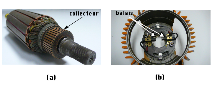 Le rotor (a) (partie en rotation de la machine) est un cylindre d'acier comportant sur sa surface des conducteurs dont les extrémités sont reliées aux lames d'un collecteur. Sur la partie fixe de la machine (b), deux balais en charbon viennent frotter sur le collecteur, constituant les bornes électriques du moteur ou du générateur (fonctionnement réversible). |
