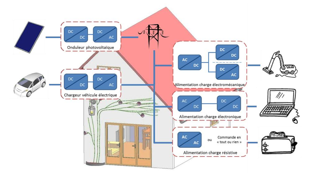 Source - © 2012 C. Jaouen Figure 9 : Importance de la présence des convertisseurs électroniques de puissance dans notre quotidien, sous une distribution électrique en courant alternatif, dans un contexte de production photovoltaïque et d’utilisation de véhicule électrique. Thèse C. Jaouen, 2012. |