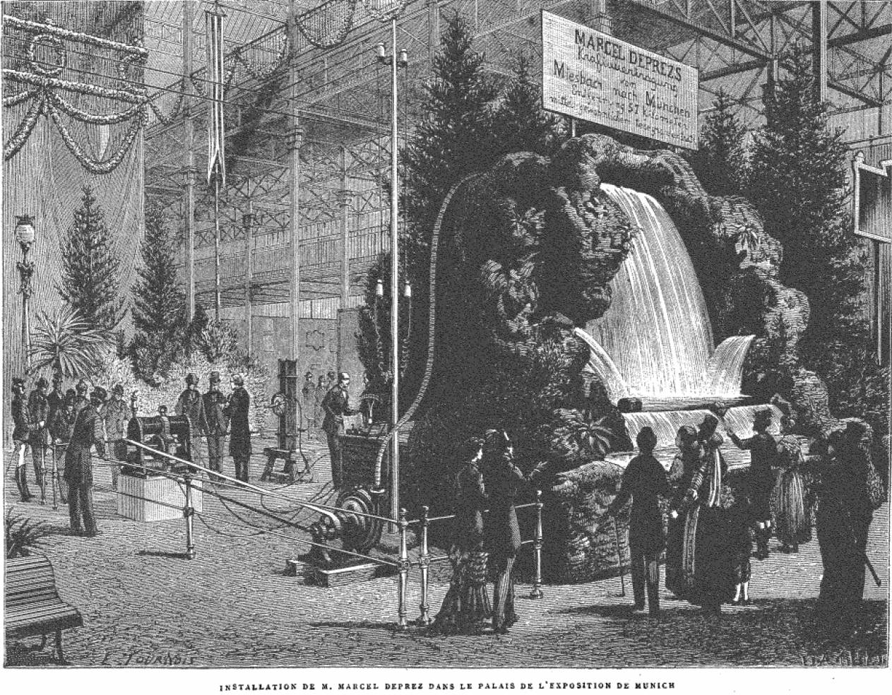 Marcel Deprez démontre une transmission à courant continu de 57 km de Miesbach (machine à vapeur entraînant une dynamo) à Münich (moteur à courant continu entraînant une pompe centrifuge pour réaliser la cascade que l'on voit sur la gravure). La ligne de transmission exploitait un fil télégraphique en fer de 4,5 mm de diamètre et avait une résistance de 950 ohms. La puissance utile était d’environ 440 W, avec une tension de 1,34 kV au départ, il restait 850 V à l'arrivée, soit un rendement de transmission de 60% et si l'on considère le rapport des puissances mécaniques. Quant à la transmission d'énergie mécanique (on parlait alors de transmission de force motrice), son rendement global mécanique (puissance sur l'arbre de la pompe sur la puissance de la machine à vapeur) valait 38%. (interprétation issue de la revue La Lumière Electrique, 5ème année, tome XIII, 3 février 1883, pp 129-132, disponible aux archives du CNAM : http://cnum.cnam.fr/DET/P84.8.html) |