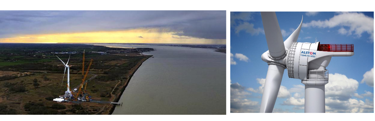 Les éoliennes modernes sont toutes réalisées avec des machines à courant alternatif et un convertisseur électronique de puissance qui permet un fonctionnement à vitesse variable pour une meilleure optimisation de la récupération de l’énergie du vent. Ainsi, aux vents faibles, l’éolienne tourne lentement et aux vents forts, elle tourne plus rapidement. On sait faire aujourd’hui des génératrices d’éolienne entièrement à aimants permanents et capables de convertir directement (c’est-à-dire sans multiplicateur à engrenages) le mouvement très lent des grandes turbines. Par exemple, l’exceptionnelle éolienne Haliade d’Alstom (figure 5), prévue pour l’offshore, comprend une turbine de 150 m de diamètre qui entraîne à une vitesse de l’ordre de 11 tr/min une génératrice à aimants de 6 MW, soit un couple de près de 6 millions de N.m, et tout cela en haut du mât.