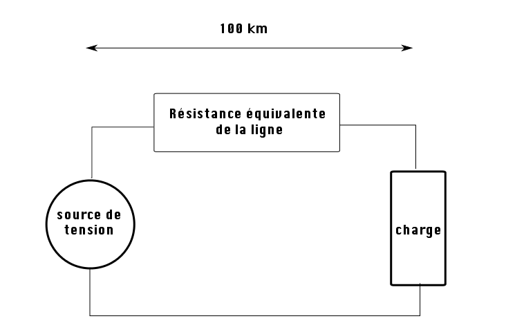 En courant continu, si la tension en début de ligne vaut 63 kV, on en perd la moitié et le rendement de transmission est d'environ 50 % !