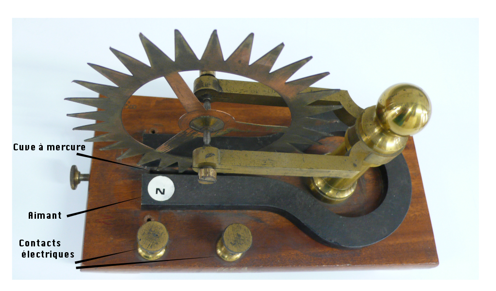 Les premières machines électriques sont imaginées durant les décennies suivant l’expérience d’Oersted (1820, interaction mécanique entre une aiguille aimantée et un conducteur parcouru par un courant électrique). Comme le courant continu était la seule forme d’énergie électrique disponible (piles électrochimiques) et que les structures les plus performantes étaient fondamentalement à courant alternatif, il fallu imaginer dès le départ des commutateurs mécaniques (collecteurs). La seule machine électrique réellement à courant continu est représentée par la roue de Barlow (figure 1), mais ce principe est resté totalement marginal et n’a donné lieu qu’à de très rares développements industriels.