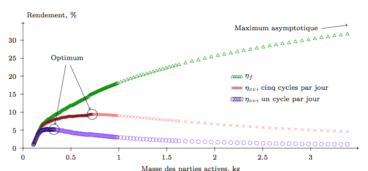 La figure 3 présente des résultats correspondant à un moteur de volet roulant, dont la particularité est de fonctionner sur une durée cumulée faible durant toute sa vie (un cycle de montée-descente dure de l’ordre de la minute). Ainsi, il apparaît que maximiser le rendement sur cycle de vie se traduit par un relativement faible rendement en fonctionnement. Pour 1 seul cycle de montée-descente durant 20 ans, l’optimum du rendement sur cycle de vie (environ 5 %) se traduit ici pour une masse d’environ 0,3 kg et un rendement sur cycle de l’ordre de 9 % (courbe verte). Un si faible rendement (environ 5 %) se traduit par une dissipation thermique importante, qui peut rapidement devenir une contrainte majeure de dimensionnement, mais qui est rendue possible ici par la très courte durée de fonctionnement, ce moteur serait bien sûr incapable de faire plusieurs cycles de montée-descente d’affilée. On peut également constater que si l’usage envisagé est plutôt de 5 cycles par jour (ce cas correspond à des systèmes automatiques permettant de réguler les apports solaires pour limiter par exemple les besoins de climatisation), l’optimum se situe pour une masse plus élevée, de l’ordre de 0,7 kg et donc pour un rendement sur cycle un peu meilleur (de l’ordre de 14 %).