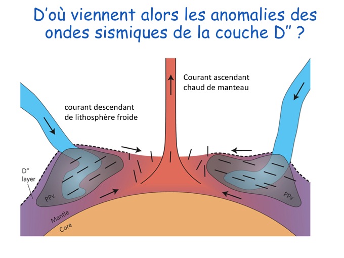 Les géophysiciens pensent qu'il y a des panaches convectifs au niveau de cette couche D" (figure 8), créés par les mouvements de la lithosphère froide et du manteau chauffé par le noyau liquide. Les flux et reflux de matière vont orienter les plans de la post-perovskite. Ainsi l'anisotropie cristalline est liée à l'anisotropie élastique : les ondes sismiques ne se comportent pas de la même façon quand elles traversent les zones de textures différentes.