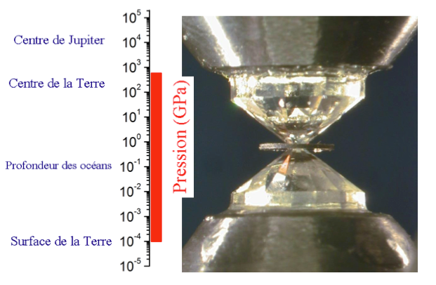 À l'aide de la cellule à enclumes de diamant, on peut atteindre des pressions variant de 0,1 MPa à presque 103 GPa. Cette gamme de pressions est comparable à celle présente dans l'intérieur de la Terre, voir figure 2. La cellule à enclumes de diamant est ainsi un outil qui permet d'explorer ce qui se passe à l'intérieur de la Terre.