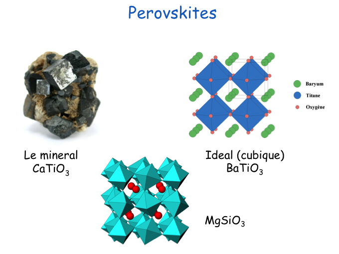 Différentes structures de perovskites sont représentées sur la figure 5. On trouve de la perovskite CaTiO3 sur la surface de la Terre. Sa structure est semblable à celle d'autres matériaux utilisés d'intérêt technologique comme les supraconducteurs de haute température critique. La structure idéale de la perovskite est le titanate de Barium BaTiO3. C'est une structure cubique dans laquelle les titanium (octaèdres) sont au centre, les oxygènes sont placés aux sommets et les atomes de barium sont placés entre les octaèdres. Cette structure est plus simple que la perovskite composant la couche D" (MgSiO3), car les axes des octaèdres ont légèrement glissé et amènent une petite distorsion.