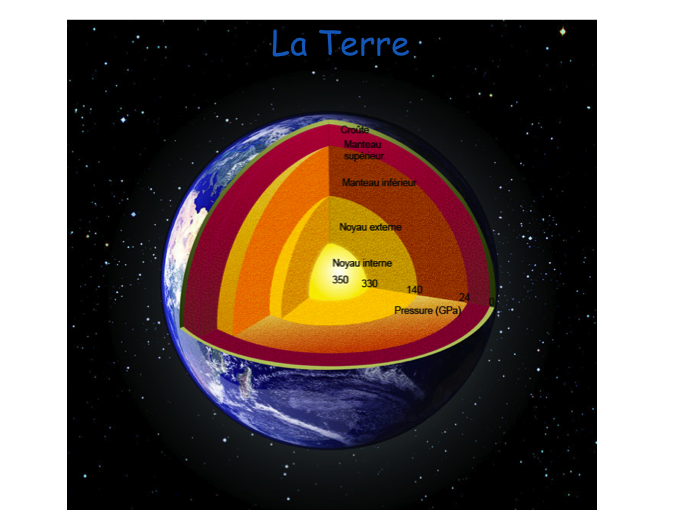L'intérieur de la planète Terre se découpe de la manière suivante : la croûte, le manteau supérieur, le manteau inférieur, le noyau externe et le noyau interne ou graine. Sur la figure 1, ces différentes couches sont représentées avec les pressions associées, qui peuvent atteindre 350 GPa (soit 3,5 millions d'atmosphères). Les températures pourraient monter jusqu'à 6 000 K environ.