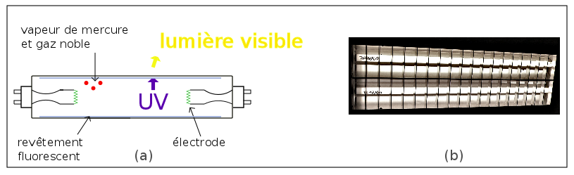 Une décharge électrique traverse un gaz constitué d'un mélange de vapeur de mercure et d'un gaz noble, et produit un rayonnement ultraviolet (figure 3 (a)).