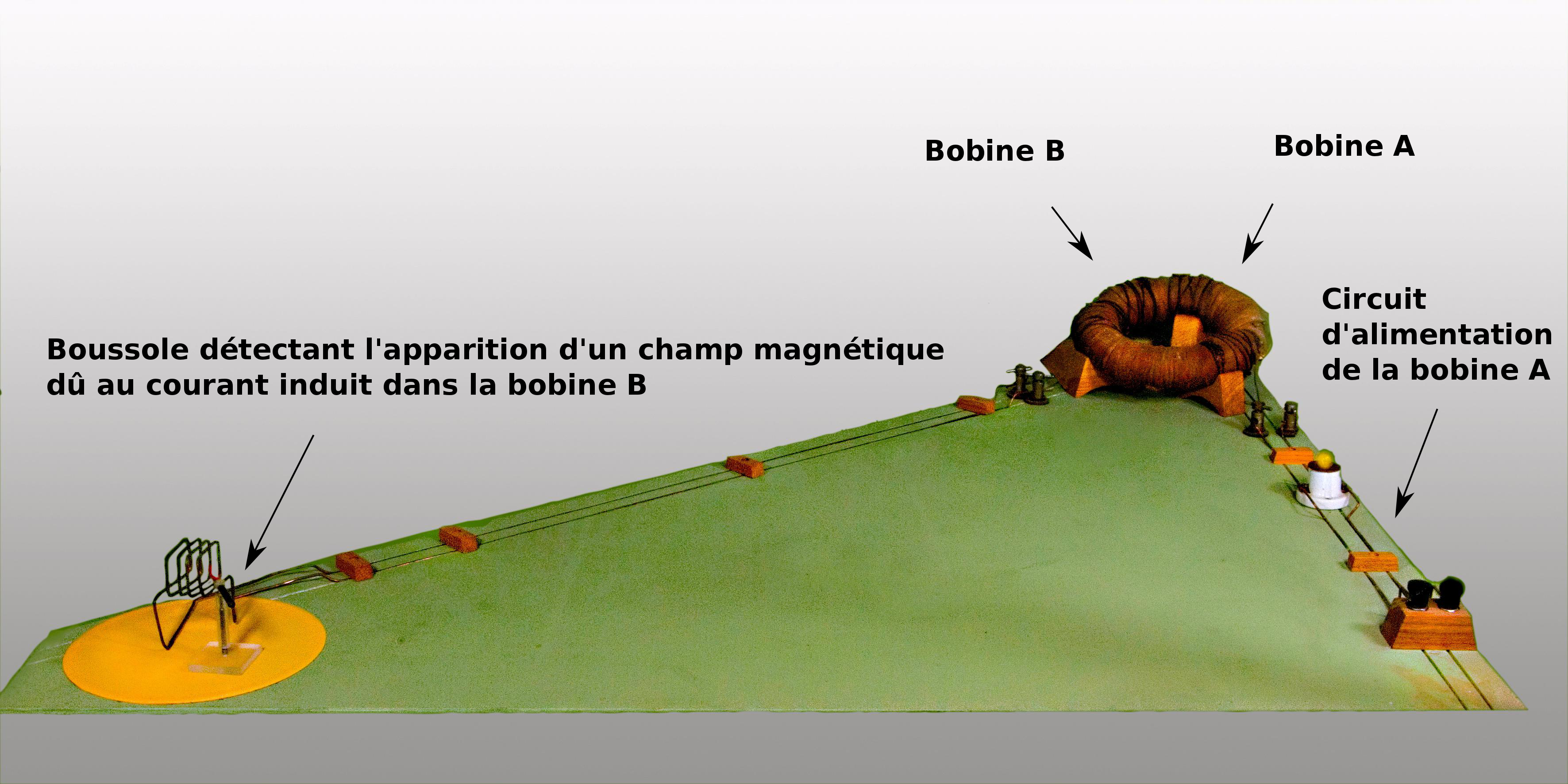 Dans l’expérience de Faraday, il y a deux bobines, A et B enroulées chacune sur la moitié d'un anneau de fer doux dont elles sont isolées par des rubans de tissu. Il n'existe pas de liaison électrique entre elles. La bobine A est connectée à une pile par un interrupteur. Les extrémités de la bobine B sont reliées par un fil, l’ensemble formant un circuit fermé. Lorsque l’on ferme l’interrupteur, un courant s’établit dans la bobine A, provoquant l’apparition d’un champ magnétique et donc une variation de flux magnétique à travers la bobine B : celle ci est alors le siège d’une force électromotrice d’induction et d’un courant induit que l’on détecte par la déviation d’une boussole placée au voisinage du fil. Lorsque l’on ouvre l’interrupteur, les mêmes phénomènes se produisent mais en sens inverse.