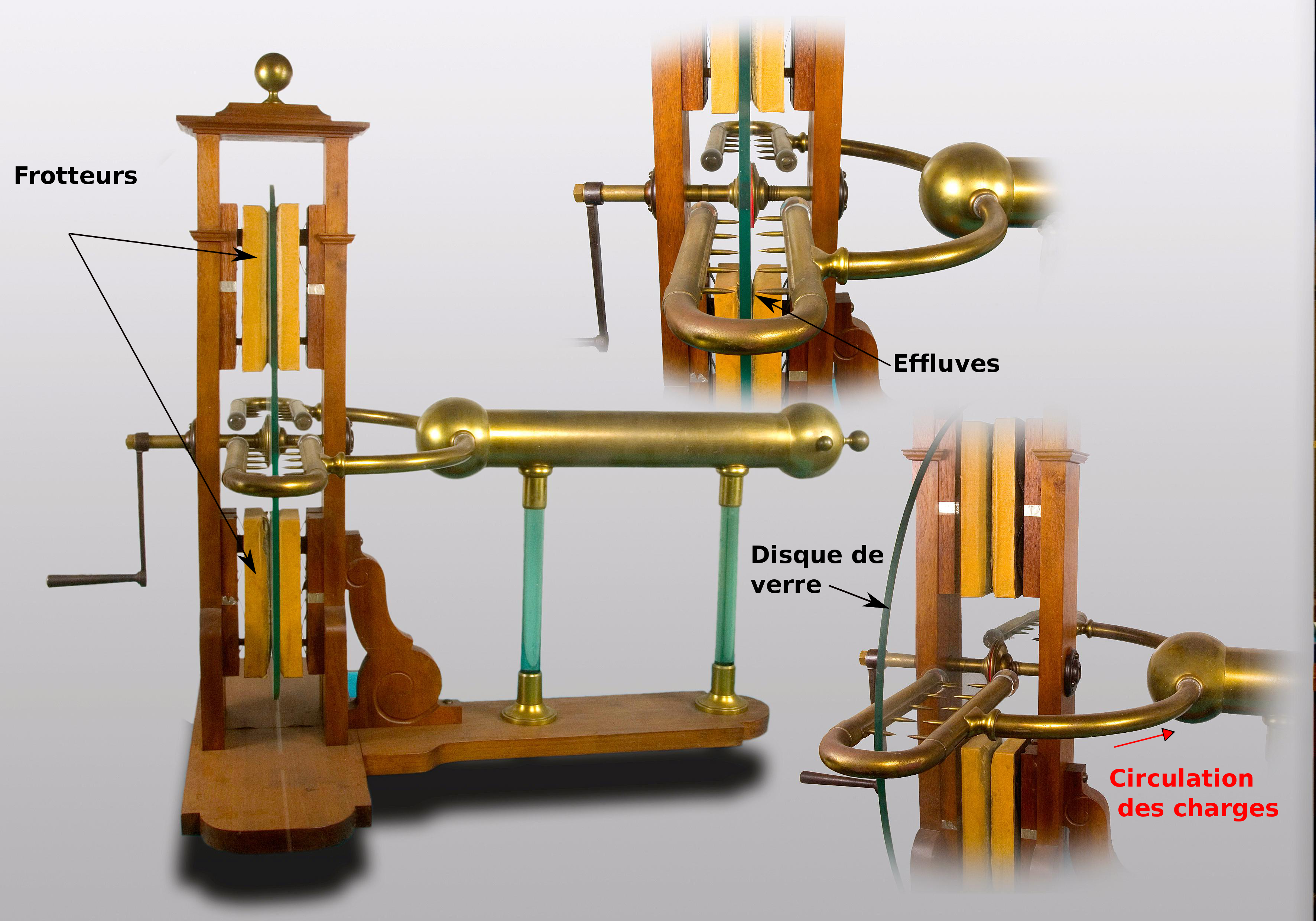 Grâce au pouvoir des pointes, des effluves se produisent et provoquent le transfert des charges du disque vers le cylindre conducteur relié aux pointes. La tension créée par ces charges transférées peut atteindre plusieurs milliers de volts !