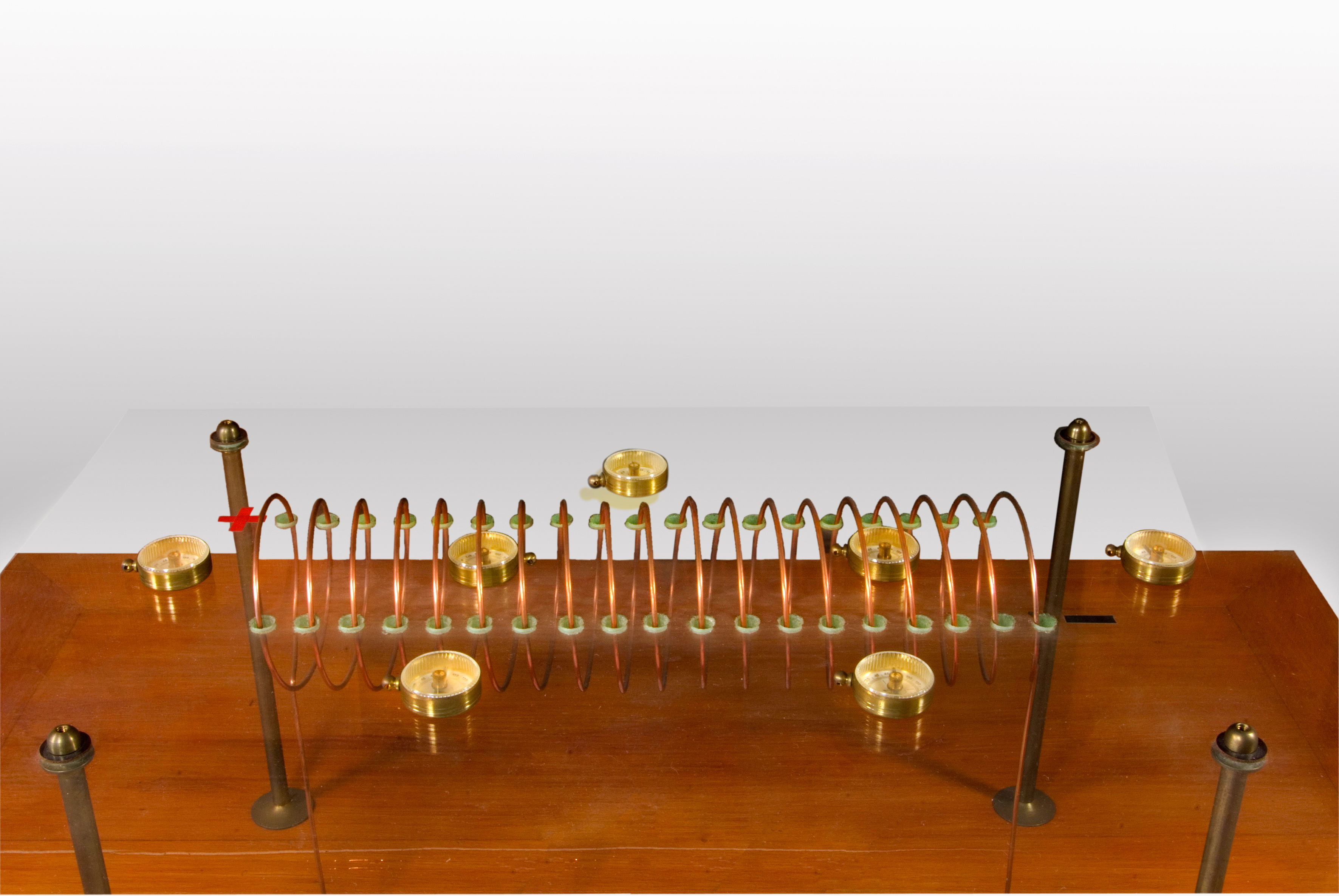 Lorsqu’il est parcouru par un courant électrique, le solénoïde produit un champ magnétique qui est mis en évidence par la déviation des boussoles qui l’entourent. Dans la figure 10 (cliquez sur l'image pour l'agrandir), comme les petits grains de limaille, les petites boussoles vont s'orienter en suivant les lignes de force du champ magnétique. Ces lignes de force sont identiques à celles que produirait un barreau aimanté à la place du solénoïde.