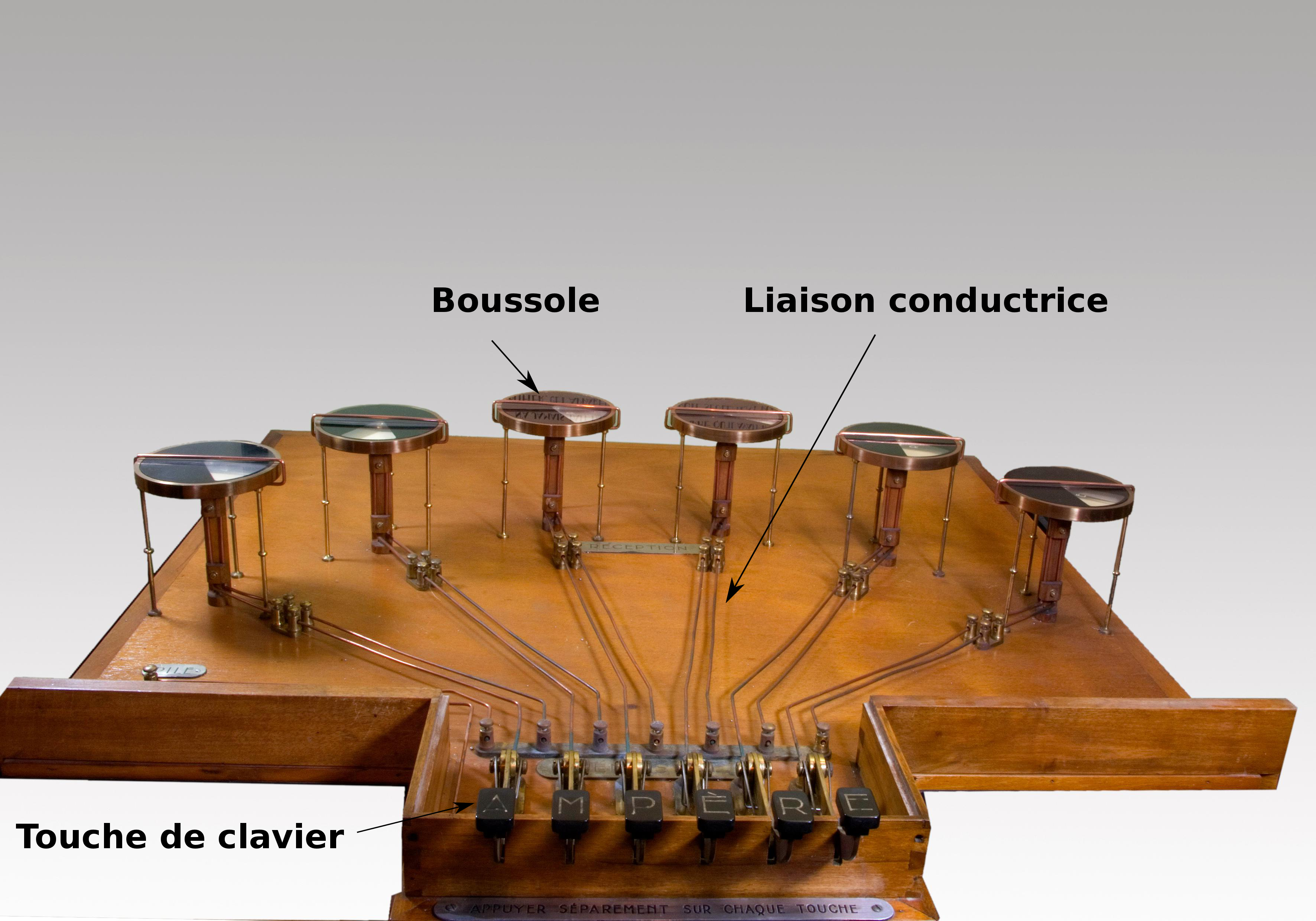 Pour transmettre un caractère, l’expéditeur, appuie sur la touche correspondante du clavier, ce qui ferme la liaison conductrice et fait dévier la boussole affectée à ce caractère. Le destinataire sait alors quel est le caractère envoyé. L’inconvénient de ce dispositif est le grand nombre de fils nécessaires, et leur longueur quand la liaison est à grande distance, ce qui empêcha sa réalisation