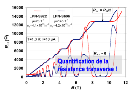 Lorsque le circuit est soumis à un champ magnétique assez intense (jusqu'à 12 T) et à basse température (1,5K), on voit apparaitre des plateaux de valeurs de résistances, figure 4. Si l'on mesure chaque plateau, on découvre qu'il est égal à RK (constante du nom du découvreur von Klitzing et correspondant au quantum de résistance) divisé simplement par le numéro du plateau (i).
