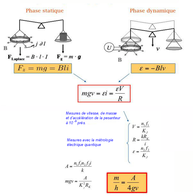 Finalement la partie mécanique (vitesse, constante de gravité) se mesure très bien à 10-9 près, et de l'autre coté, la partie électrique (deux tensions et une résistance) à 10-10 près (mesures en cours au LNE). Lorsque cette mesure est réalisée, on relie ainsi la masse étalon à la constante de Planck.